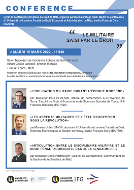 Lors de cette nouvelle rencontre du cycle de conférences d’histoire du droit de Metz, nous vous proposons des interventions autour du thème « Le militaire saisi par le droit » :