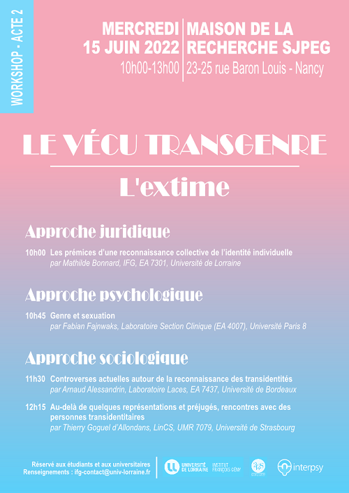 Le projet Vécu transgenre : approches psychologiques, sociologiques et juridiques est un projet pluridisciplinaire dont l’ambition est de mobiliser ces trois sciences pour appréhender de manière complète et globale le vécu des personnes opérant une transition d’un genre à l’autre. Si le droit a longtemps limité son approche à la notion de transsexualisme, conditionnant la production d’effets juridiques à une transformation du corps d’ordre biologique, l’assouplissement des conditions de modification de la mention du sexe à l’état civil aboutit à la prise en compte d’une transition plus sociale que biologique et, conséquemment, à la reconnaissance d’un vécu transgenre et non plus seulement transsexuel. Il s’agit de mettre cette évolution législative en perspective avec les approches psychologiques et sociologiques de la question, afin notamment d’évaluer son adéquation avec les attentes sociales sur la question.