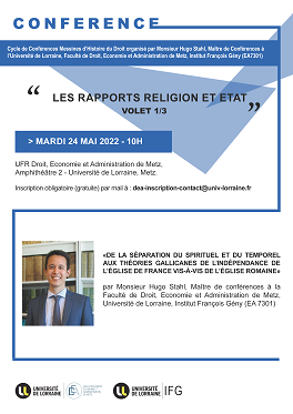 Dans le cadre du cycle de conférences d’Histoire du Droit de Metz, Monsieur Hugo Stahl, Maître de conférences à l’Université de Lorraine, Faculté de Droit, Economie et Administration de Metz, vous propose 3 conférences sur le thème