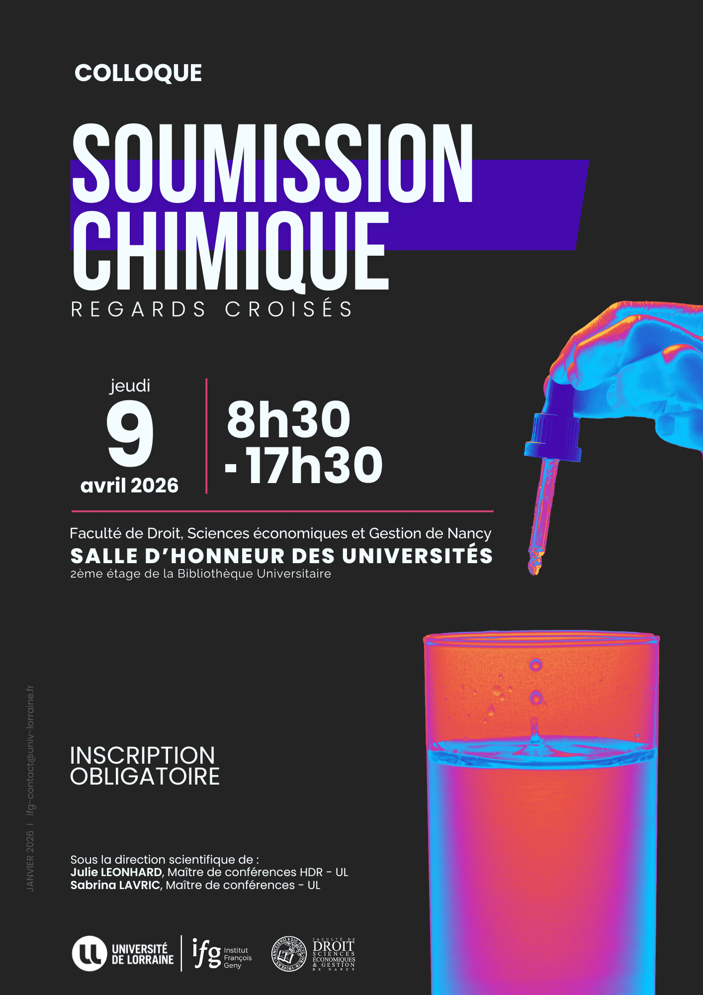 Ce colloque pluridisciplinaire a pour ambition de croiser les regards des différents acteurs concernés par la soumission chimique (médecins, pharmaciens, juristes, forces de l’ordre, magistrats, anthropologues, associations et chercheurs). Les échanges porteront sur les aspects juridiques (qualifications pénales, preuves, difficultés d’enquêtes et droits des victimes), criminologiques (profils des auteurs et des victimes), toxicologiques et cliniques (substances impliquées, délais de détection, détections plurielles et protocoles de prélèvements), médico-psychologiques (prises en charge des victimes et accompagnements post-traumatiques), mais aussi sur les actions de prévention et de formation (sensibilisation du grand public, des professionnels de santé et de la justice).